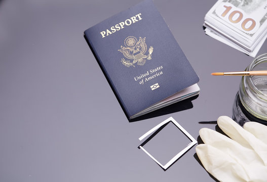 Passport of United States of American. Traveling passport.  closeup of an american passport and money. Concept of counterfeiting documents.