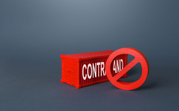 Red cargo ship container with the word Contraband. Fight against drug trafficking, counterfeiting and duty-free import, a threat to the security of the economy. Violation of sanctions.
