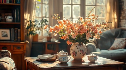 Rustic mason jar filled with freshly picked flowers, illuminated by natural light against a wooden backdrop to evoke a country garden aesthetic