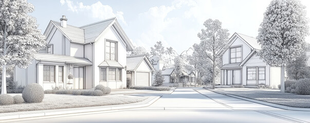 Continuous Line Drawing of a Village Landscape with Houses, Trees, and Church on Transparent