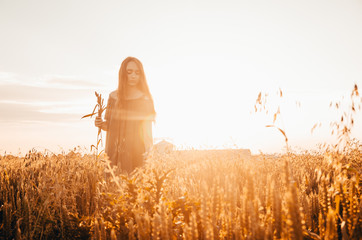 Back view, a young beautiful woman in a white dress on a Golden wheat field admiring the harvest.