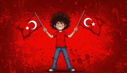 Joyful Patriot: A spirited child proudly waves two Turkish flags in a vibrant, stylized illustration, exuding national pride.