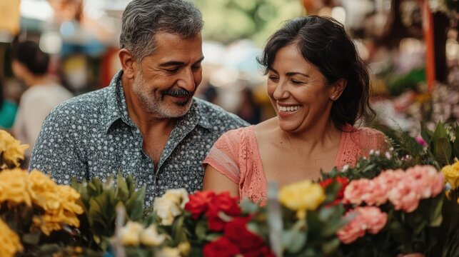 A middle-aged Hispanic couple in their 40s both with dark hair choosing flowers at a bustling flower market their smiles bright.