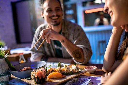 Young caucasian couple eating sushi while on a date at a sushi restaurant