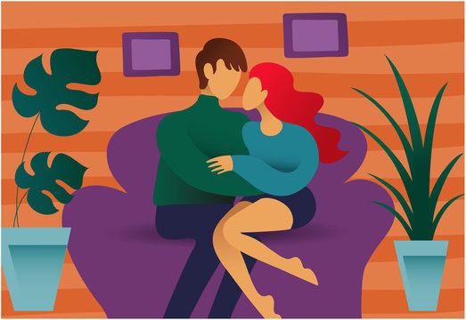 Cartoon Man Woman Couple Sitting Together on Sofa