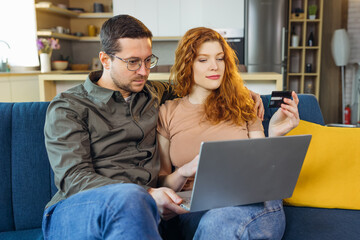 Photo of young happy loving couple in home indoors on sofa using laptop computer holding credit card.