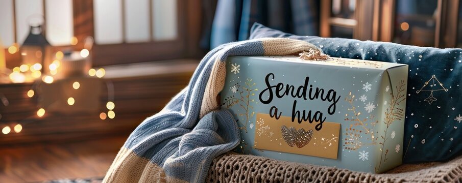 A comforting gift box with a blanket and a "Sending a hug" card, in a cozy corner.