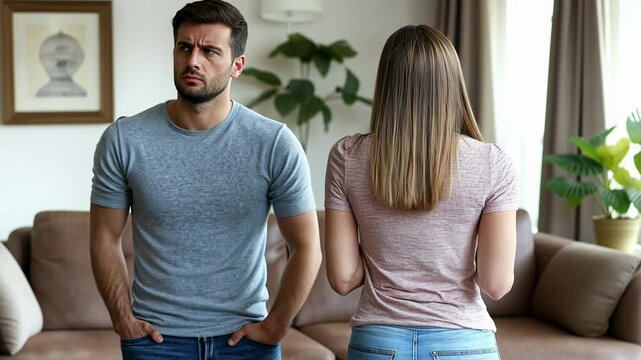A couple is engaged in a heartfelt exchange in their living room, revealing underlying tension as they confront difficult feelings. The atmosphere reflects emotional struggles.