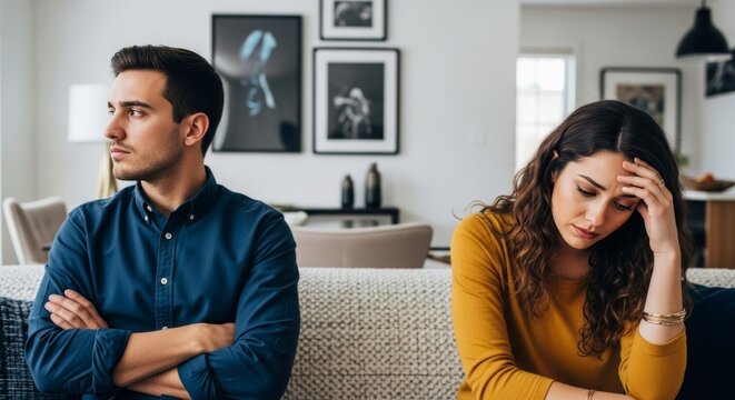 Upset couple sitting apart on sofa after argument, woman holding head in hands while man looks away with crossed arms in modern living room