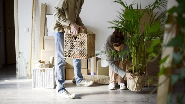 joyful young family of happy guy and woman wearing casual clothes carries boxes with different belongings. Couple celebrating moving day hugging and kissing give five together into large room