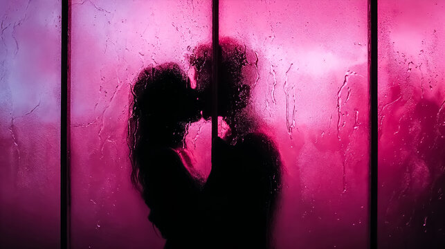 Silhouette of a couple in love kissing behind the glass. Slow motion.