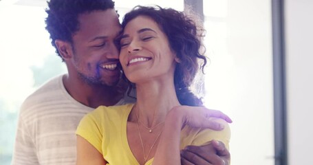 Couple cooking, preparing a meal and having fun together while bonding, talking and flirting in a home kitchen. Smiling, happy and affectionate husband and wife making healthy food for a date night
