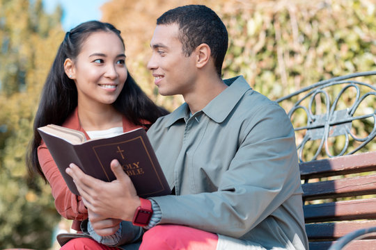 Cheerful young people spending day with book