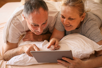 Senior couple enjoying at home and watching something on the tablet before sleeping.