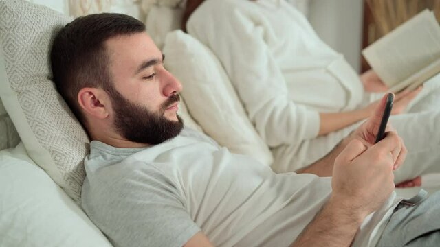 Beautiful young wife reading a book wearing pajamas while the husband is covering the face with sleep mask.