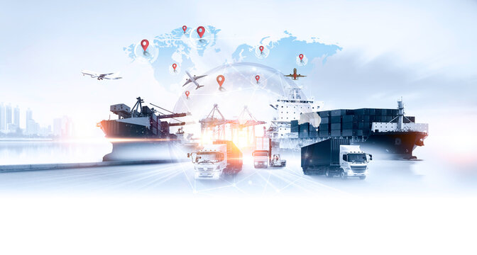 Global business of Container Cargo freight train for Business logistics concept, Air cargo trucking, Rail transportation and maritime shipping, Online goods orders worldwide