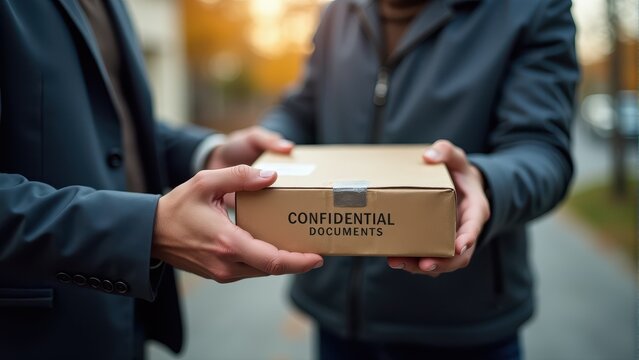 Two people exchange a box labeled "Confidential Documents" outdoors, highlighting themes of discretion and secure document handling
