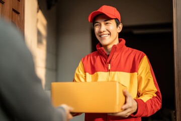 Smiling Delivery Person Handing Over a Brown Package at Doorstep