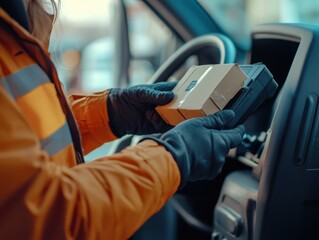 Delivery Driver Using Handheld Scanner in Vehicle Package