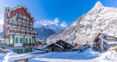 View of chalets and snow covered mountains in Courmayeur at sunrise in winter, Courmayeur, Aosta Valley, Italian Alps