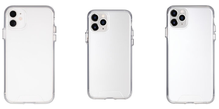 Female hand holding white smartphone in soft silicone cover back view . Phone case mock up isolated on green background shadow from a plant