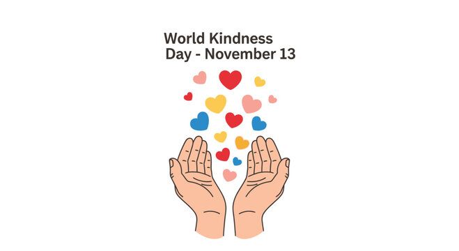 Colorful illustration for world kindness day, featuring hearts and birds, promoting kindness and compassion worldwide