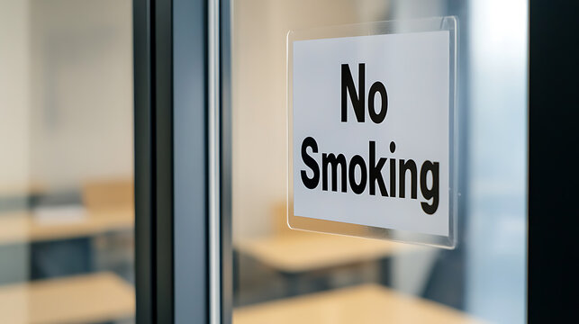 A "No Smoking" sign is displayed on a glass door, indicating a smoke-free environment. The sign promotes health and safety, ensuring clean air for everyone inside the building.