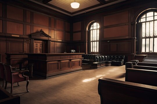 Vintage wooden courtroom interior. 3D Rendering. Retro style. Empty huge vintage courtroom view, AI Generated