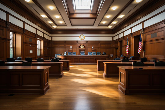 Courtroom interior. Empty Courthouse room interior. Law and Justice concept. Generative AI