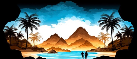 Tropical sunset adventure serene beach cove digital art calm environment wide-angle view nature escape