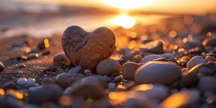 Heart-shaped rock on a beach at sunset, surrounded by smooth pebbles and a vibrant, golden light creating a serene and romantic atmosphere.