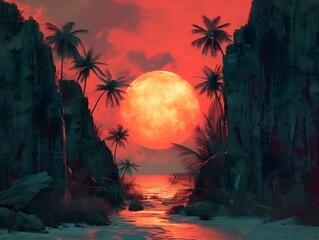 Moonlight reflecting off the calm surface of a peaceful cove, creating a shimmering path across the water towards a small, secluded beach surrounded by lush foliage