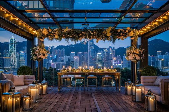 A wooden deck adorned with candles and flowers in a sophisticated rooftop venue, overlooking a sparkling cove, A sophisticated rooftop venue overlooking a sparkling city skyline