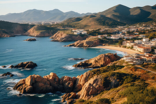 A breathtaking sunset over a secluded coastal cove, with golden hues reflecting on the calm turquoise water, creating a serene atmosphere