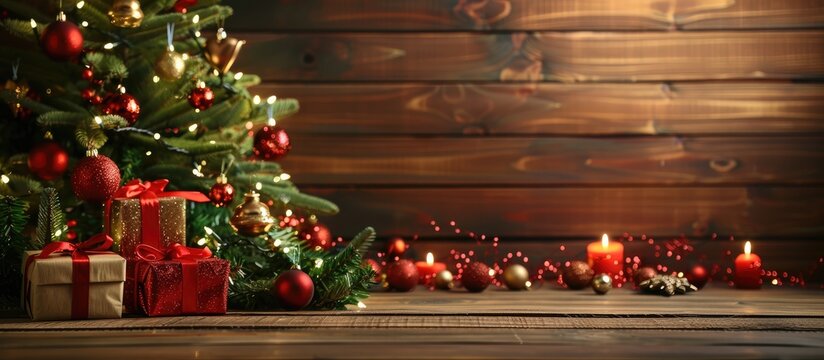 Home decoration with Christmas gift boxes and a Christmas tree beautifully arranged on a wooden table, creating a festive atmosphere. Copy space image available.