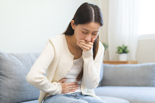 Unhappy pregnant asian young woman, pain girl suffering from nausea, having vomit feeling sick covering mouth, touching belly having problem throwing up from food poisoning, lady with morning sickness