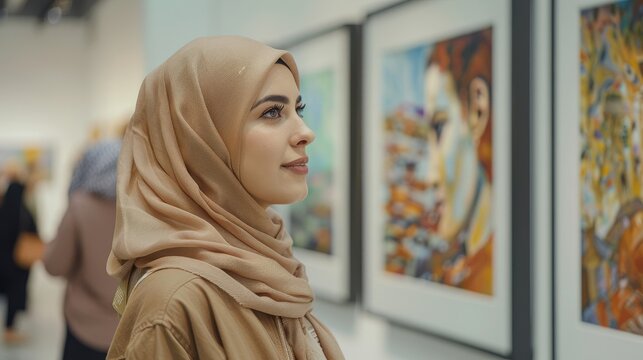 Middle Eastern women wearing hijab browsing artwork at an art gallery