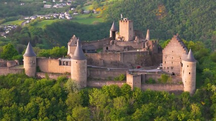 bourscheid castle château de green cover hills walls black domed towers parked visitor vehicles historic site trees to left around right circles drone luxembourg