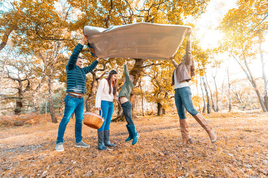 Son jumping under picnic blanket while parents laying down in park during autumn