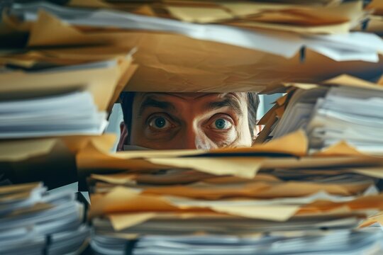 A man is covered in papers and has a look of frustration on his face