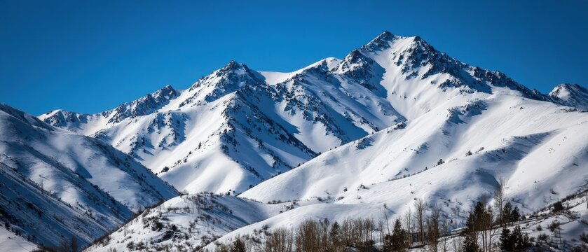 Stunning snow covered mountain range with rugged peaks under clear blue sky du winter daytime