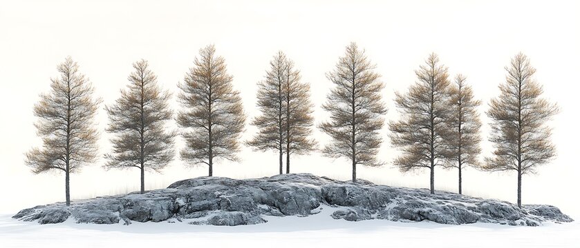 Seven small coniferous trees on a snow covered rock formation
