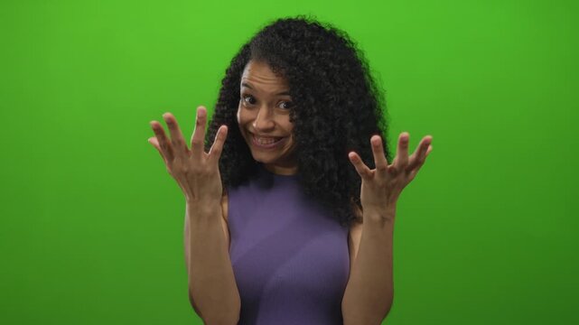 Latin woman in purple top makes money gesture with both hands in green studio; wealth desire greed success.