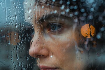 Woman observing rain splattered window in covid 19 lockdown, pondering stay at home measures