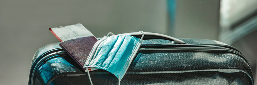 Coronavirus travel face mask with passport, plane ticket, luggages for airport traveling to summer vacation destination banner panoramic.