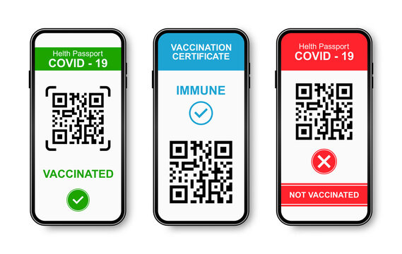Vaccine passport or COVID-19 certificate in smartphone. Health passport and certificate of vaccine, confirmation of immunity from coronavirus with qr code for control of safety in phone app. Vector