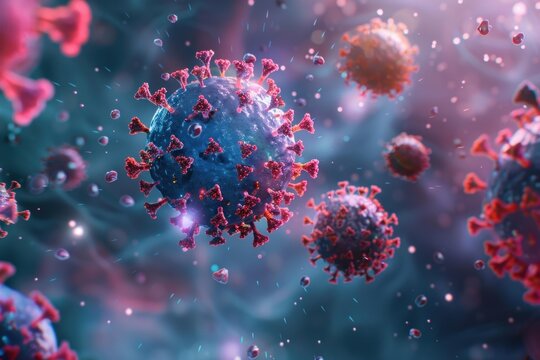 Microscopic view of coronavirus covid 19 cells floating in a blue and pink background