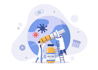 Doctor and nurse holding syringe and preparing for global vaccination against coronavirus. Covid vaccine ready for clinical trial. Immunization campaign concept. Flat cartoon vector illustration.
