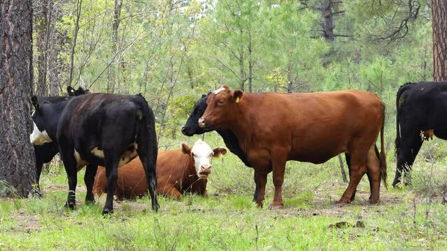 Domestic Cows grazing in Coconino National Forest in Norther Arizona, America, USA.