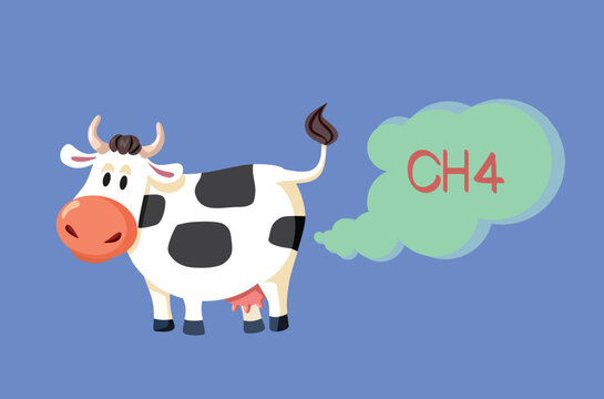 Cow Farting Producing Methane Gas Vector Cartoon Illustration. Farm animal emitting ch4 gas producing greenhouse effect